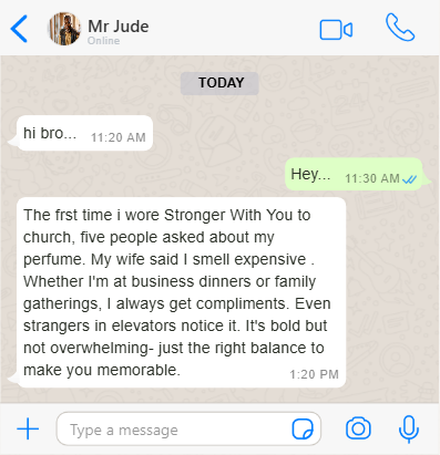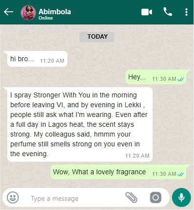 I spray Stronger With You in the morning before leaving for work in the morning, and by evening in Lekki, people still ask what i'm wearing. Even after a full day in Lagos heat, the scent stay strong . My colleague said, 'Your perfume is still strong like this ' That's rare. This fragrance keeps up with the hustle and announces your presence all day long.